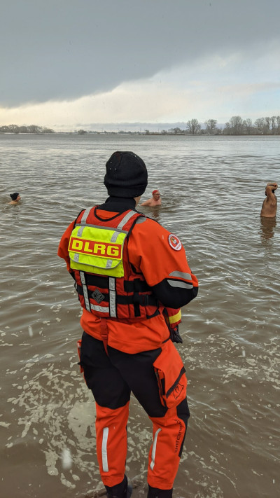 Pünktlich um 15:00 ging es los. Unter den wachsamen Augen von ca. 200 Zuschauern wagten sich ca. 50 Schwimmer in die 5 Grad kalte Weser. Trotz frostiger Temperaturen und für Braker Verhältnisse tiefem Schnee mussten weder unsere Sanitäter noch die Person im Überlebensanzug eingreifen