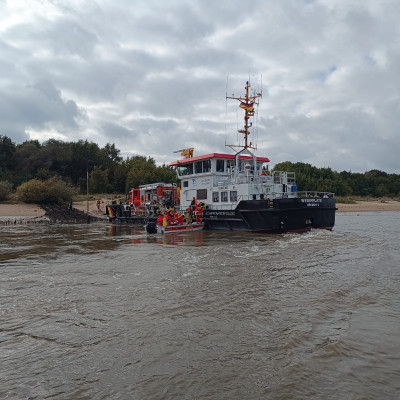 Auf dem Warflether Sand wurde dabei ein Vegetationsbrand simuliert, der von der Wasserseite aus bekämpft wurde. Unsere Einsatzkräfte unterstützten vor Ort mit logistischen Tätigkeiten und übernahmen die wasserseitige Absicherung der Übung.